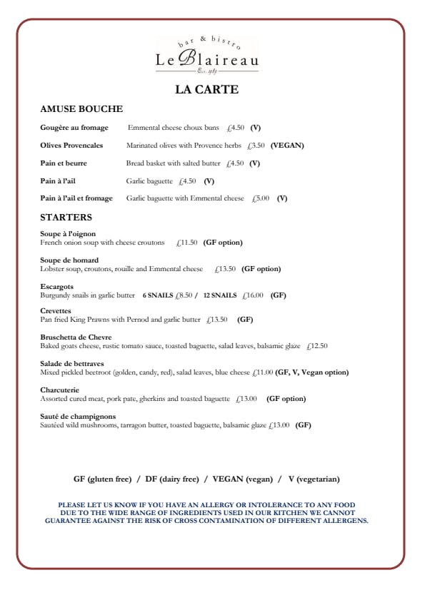 French onion soup with cheese croutonsSoupe de homard £13.50 (GF option)